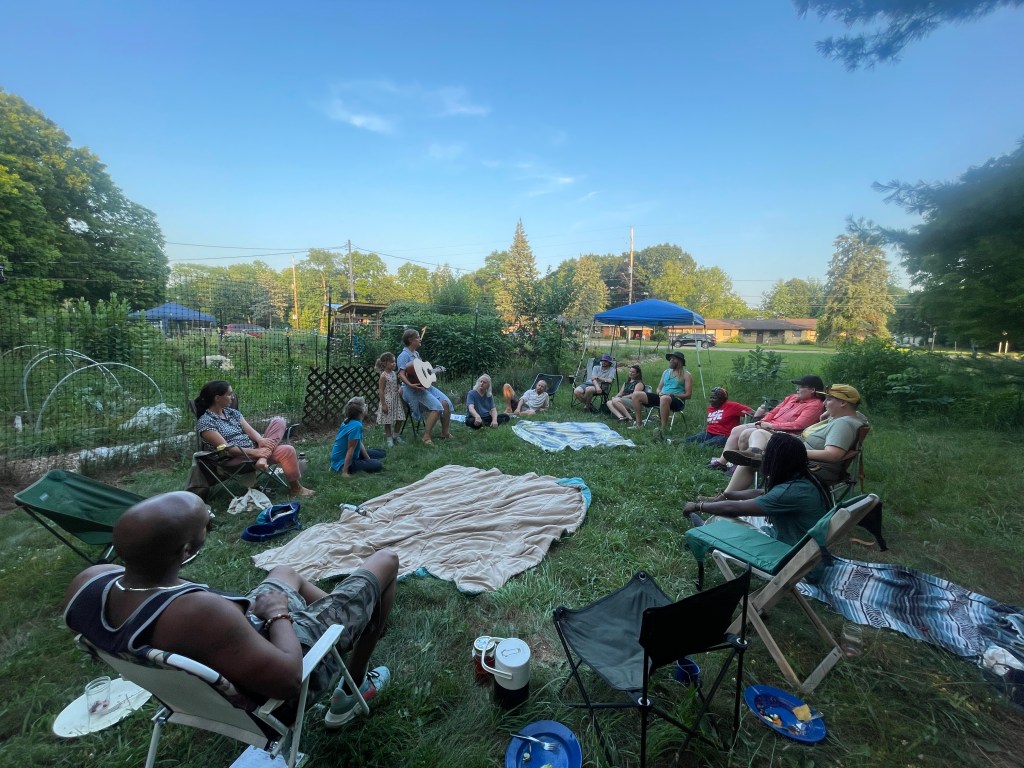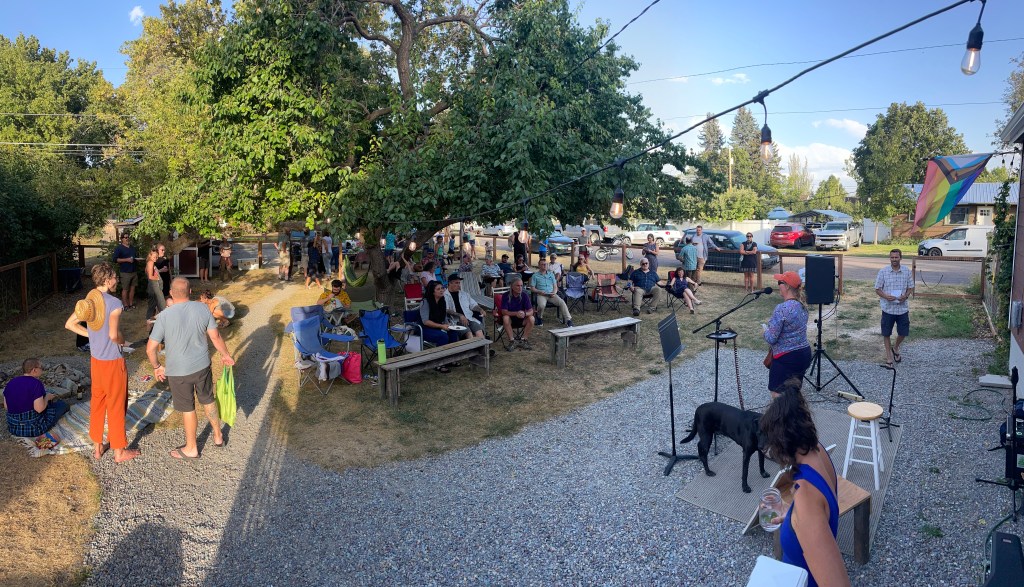 [Above: Backyard gathering at our place in Montana. One person is on the mic. Many gather to listen and also to connect with one another. Our dog is also on the stage.]